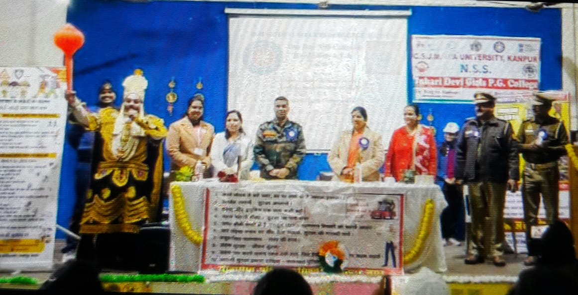 JDGPGC Kanpur: कैनाल रोड कानपुर में स्थित वर्षो से शिक्षा के क्षेत्र में अग्रणी जुहारी देवी कॉलेज में दिनांक 31 जनवरी दिन शनिवार को महाविद्यालय की एन.एस.एस अधिकारी डॉ0 ऱागिनी कुमारी के सानिध्य में द्वितीय एक दिवसीय शिविर में सड़क सुरक्षा जागरुकता कार्यक्रम का आयोजन किया गया। इस अवसर पर शहर के आईपीएस रविन्द्र कुमार मुख्य अतिथि के तौर पर पधार कर कार्यक्रम का शुभारम्भ किया। कार्यक्रम में यमराज की वेषभूशा धारित किये कलाकार ने महाविद्यालय परिसर में मौजूद छात्र छात्राओं समेत समस्त शिक्षक और कर्मचारीगणों को जीवन के मूल्य से परिचित कराते हुये सड़क सुरक्षा के नियमों का पालन करने की हिदायद दी। और यमराज की मिमिक्री करते हुये कहा है कि “यम है हम, सबके प्राण लेते है, हम”।