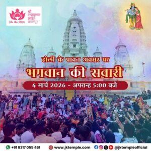 इस वर्ष होली के अवसर पर जे.के. टेम्पल कमला नगर कानपुर में भी 27 फरवरी से 4 मार्च तक रंगारंग कार्यक्रमों का आयोजन किया जा रहा है। जिसमें आज दिनांक 27 फरवरी दिन शुक्रवार को रंगभरी एकादशी के पवित्र अवसर पर भगवान जी को आस्था के रंगों के साथ गुलाल को अर्पित करके होली के दिव्य उत्सव की शुरुआत की गई।